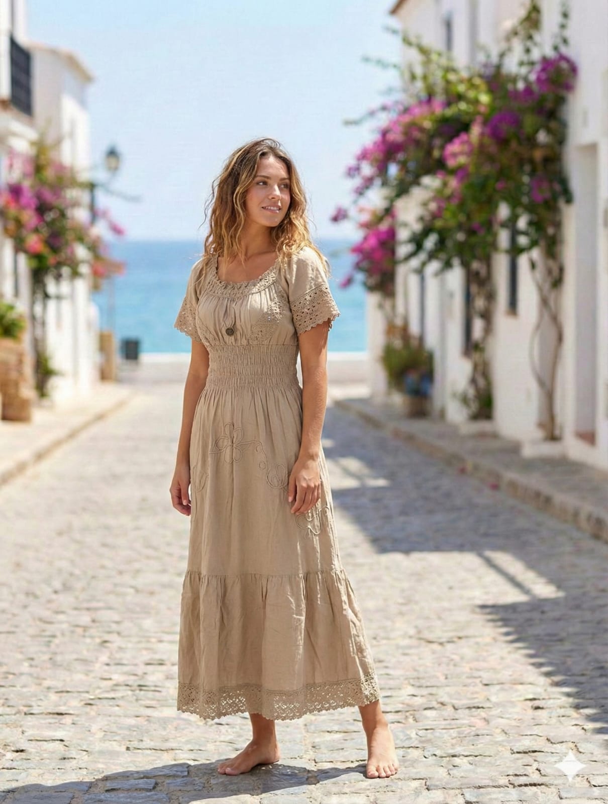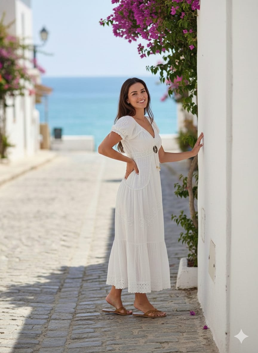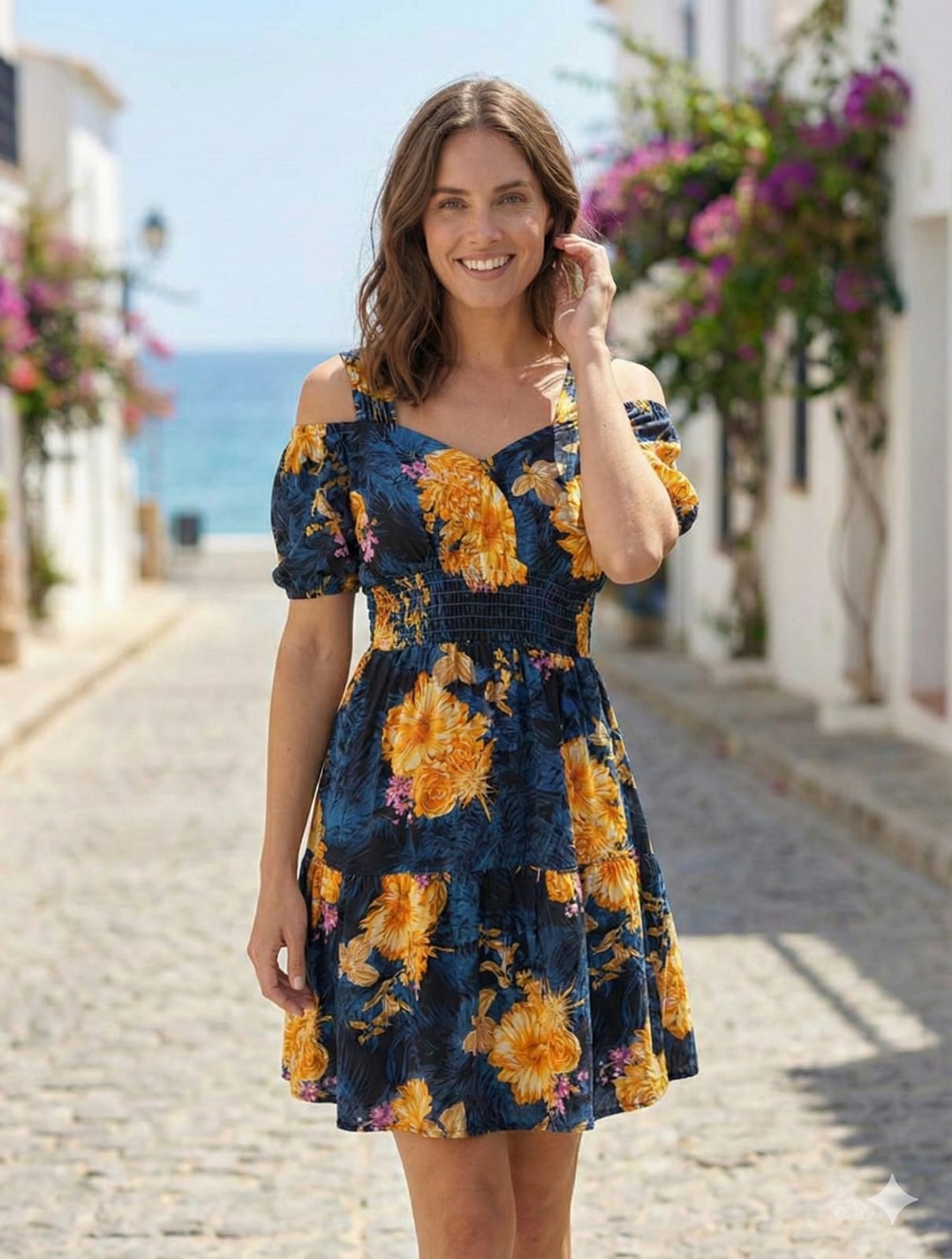 Llena de vida tu armario con este espectacular vestido halter en fucsia intenso, adornado con un llamativo estampado floral en tonos dorados que evoca la alegría del trópico. Su diseño cuenta con una cintura elástica tipo nido de abeja que define tu silueta con total comodidad, mientras que la falda de corte pañuelo (picos asimétricos) aporta un movimiento ligero y divertido a cada paso; la prenda perfecta para brillar bajo el sol.