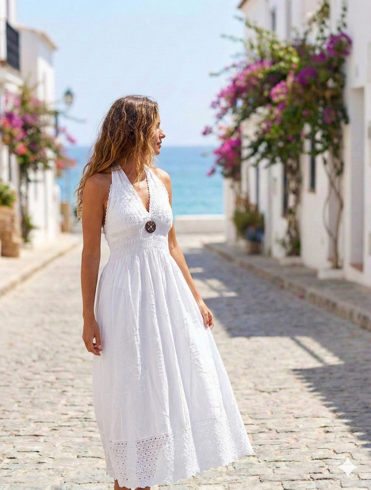 Deslumbra este verano con este romántico vestido midi en un suave tono coral, diseñado para combinar elegancia y comodidad en una sola pieza. Su favorecedor corpiño elástico en punto smock (nido de abeja) se ajusta perfectamente a tu silueta, realzado por botones decorativos y unas encantadoras mangas abullonadas que puedes lucir sobre los hombros, mientras que la falda ligera con sutiles bordados florales y un delicado remate de encaje en el bajo le da ese toque bohemio y fresco ideal para tus días de sol.