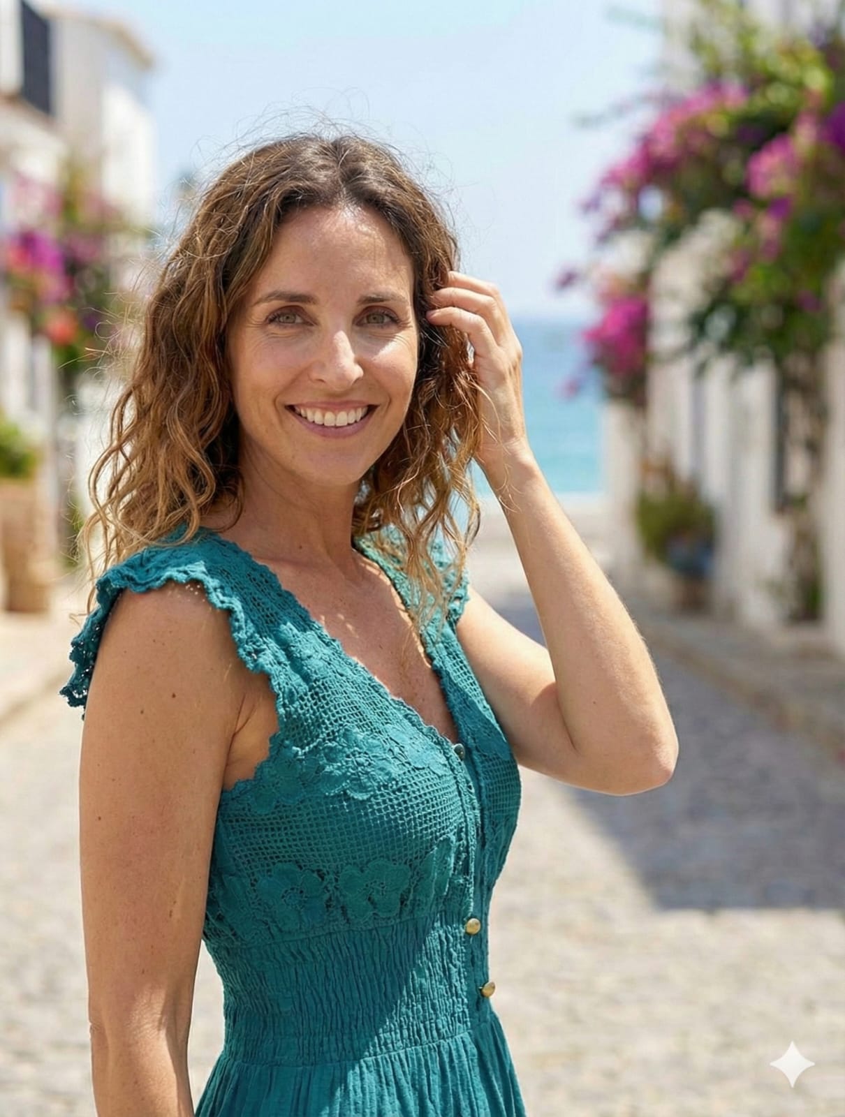 Este vestido midi en un profundo tono azul petróleo captura la elegancia bohemia con un toque sofisticado y fresco. Su diseño resalta por unas mangas cortas con volantes y un escote en V enriquecido con texturas de encaje y cordones con cuentas de madera naturales. La cintura elástica tipo nido de abeja define la silueta con total comodidad, dando paso a una falda escalonada con delicados ribetes texturizados y un dobladillo de encaje calado, ideal para lucir un look artesanal y lleno de personalidad.