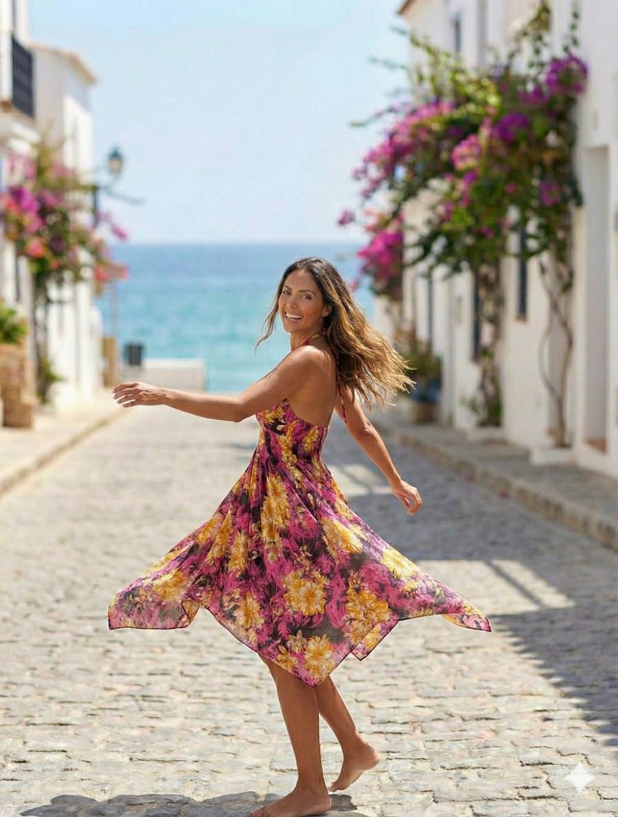 Este vibrante vestido veraniego luce un llamativo estampado floral con grandes flores en tonos amarillos y dorados que contrastan sobre un fondo fucsia intenso y negro, destacando por su fresco diseño de cuello tipo halter anudado a la nuca. Cuenta con un corpiño elástico con fruncido tipo nido de abeja (smock) que se ajusta cómodamente al busto y cintura, dando paso a una falda de caída ligera con un dobladillo asimétrico en picos que aporta movimiento y un toque bohemio, perfecto para días de sol o salidas casuales.